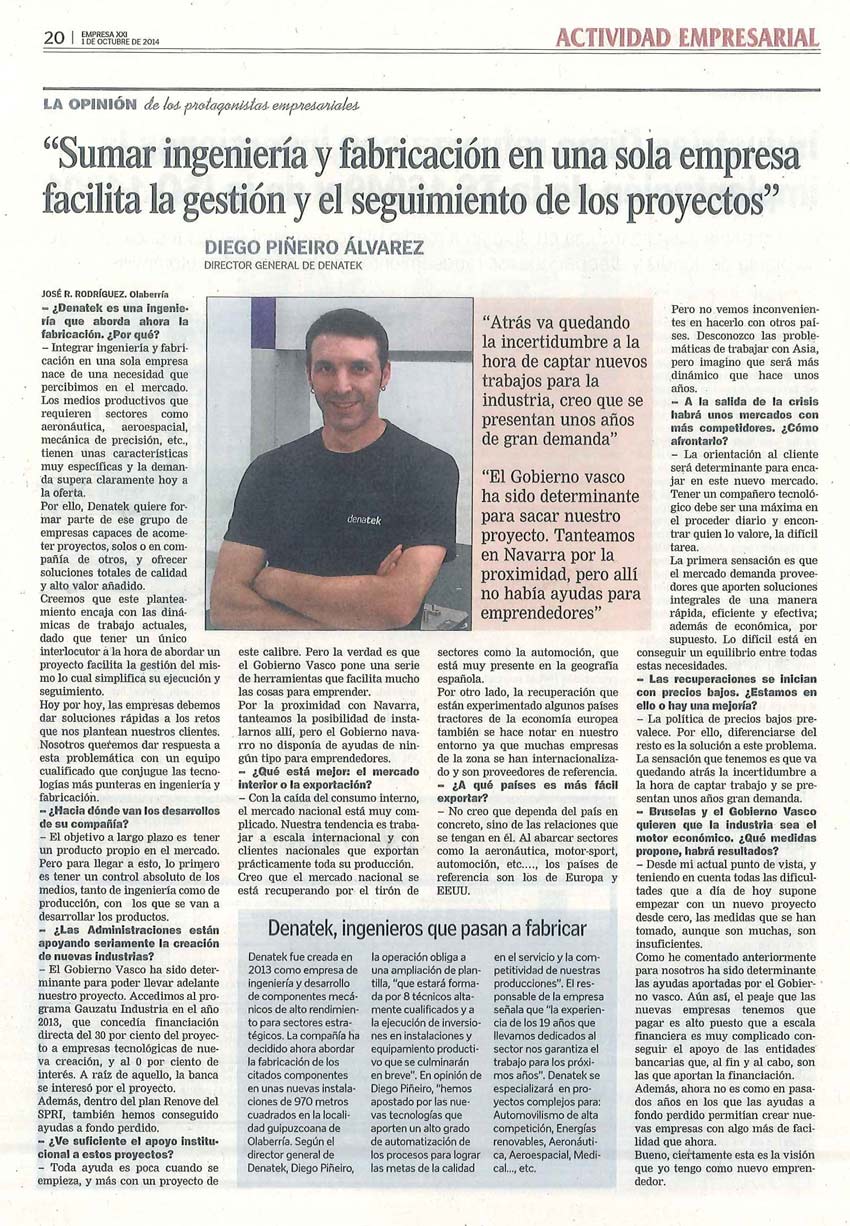 Diego Piñeiro, General Director of DENATEK, was interviewed in the Basque industrial newspaper "Empresa XXI".